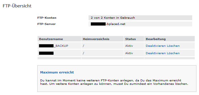 Login into your bplaced account and click on “FTP-Verwaltung” / “FTP-management” and remove the FTP-user with the right folder.